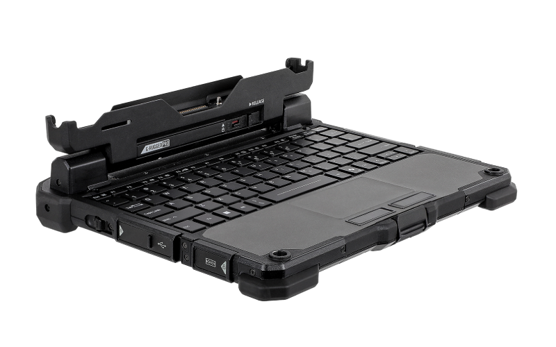 该键盘坞采用4层红色背光、82个全尺寸按键和集成触摸板,并包含一个专用的 Microsoft Copilot 键,是快速访问 AI 驱动的智能助手。内建的把手可实现用户友好的笔记本式操作,减少错误并提高执行数据密集型任务的效率。自带各种用于外接设备的I/O端口,可用于连接外设和其他设备;双重锁定机制加强了平板电脑和键盘的连接,防止键盘意外脱落。